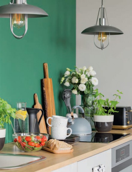 Moda na kolor jasnozielony określany też jako „kolor pączków na drzewach” również nie przemija. Zieleń żółtozielona o nazwie Greenery była kolorem roku 2017, ale stale widzimy ją w dodatkach dekoracyjnych, tekstyliach, elementach wyposażenia wnętrza szczególnie w stylu egzotycznej „urban jungle”. Warto wprowadzić mocną plamę limonki tam, gdzie zależy nam, by przestrzeń była świeża, żywa, optymistyczna i przyjemna dla zmysłów. W kuchni doskonale sprawdzi się jasnozielona boazeria, szyba nad blatem kuchennym czy fototapeta z soczystą zieloną roślinnością. Barwa ta będzie doskonale kontrastowała z meblami w kolorze białym, szarym czy czarnym, ale także pięknie skomponuje się z naturalnym drewnem. W salonie na tle ściany w kolorze limonkowym sprawdzi się szara lub beżowa sofa. Farby możemy spotkać pod różnymi nazwami, np. limonkowy jak się patrzy, ale też budzącymi skojarzenia dość odległe, np. bambusowy gaj.