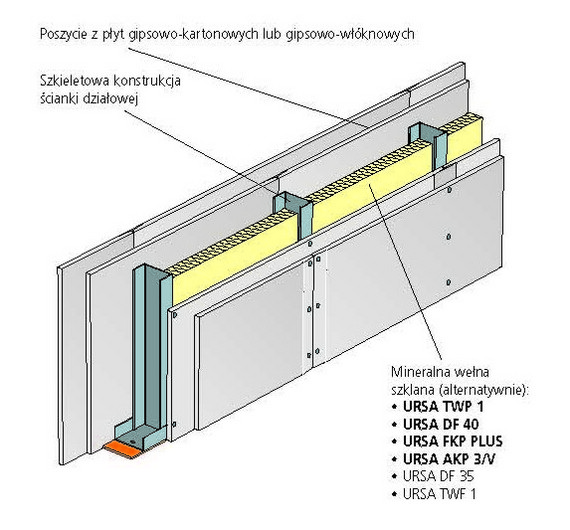 ścianek działowych uzyskuje się przy wełnie URSA o gęstości 13-20
